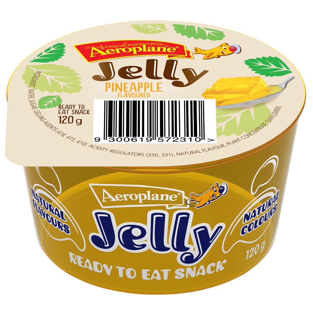 Aeroplane Pineapple Jelly Cups contain the great flavours of regular Aeroplane Jelly in a convenient ready to eat format.