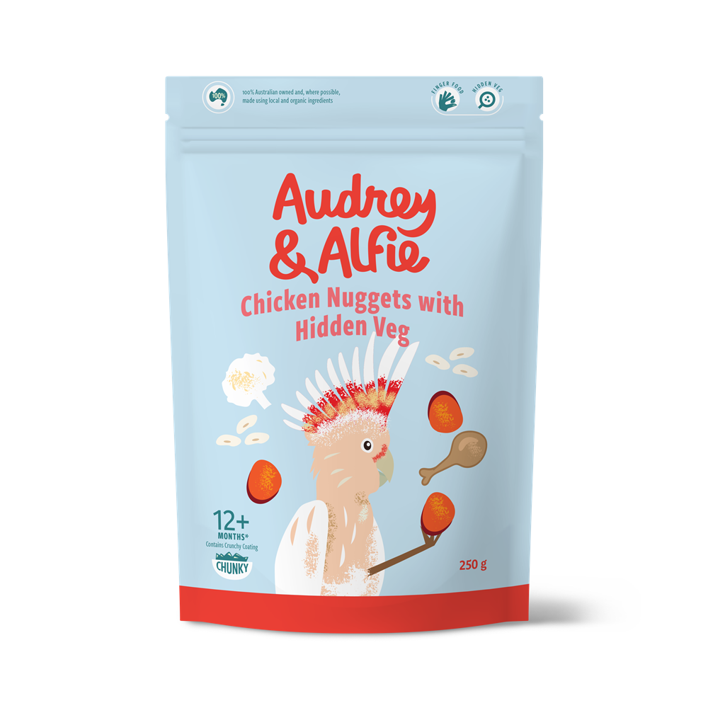 Audrey & Alfie's fabulous Chicken Nuggets pack a nutritional punch with plenty of hidden veggies and legumes. Bound with organic wholemeal flour and finished with a delicious crunchy coating, even the fussiest eaters will be coming back for more.