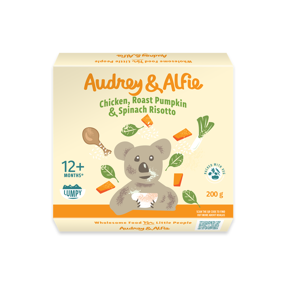 And with 7g protein per serve, Audrey & Alfie's chicken, pumpkin & spinach risotto bowl provides 50% of your toddlers' daily protein needs*, all wrapped up in one delicious parcel.